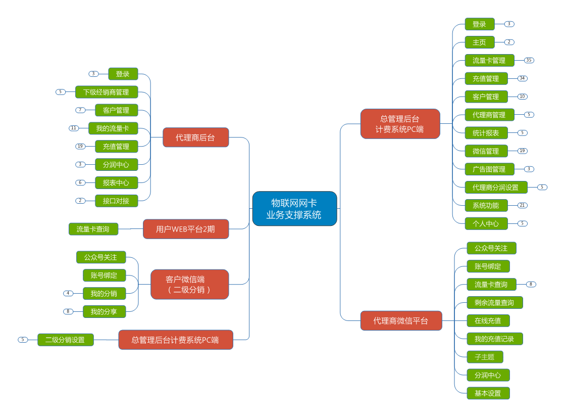总管理后台PC端主要实现流量卡管理、流量卡充值管理、客户管理、代理商管理、微信管理、广告图管理、二级分销设置、分润设置、统计报表、系统功能、个人中心等。